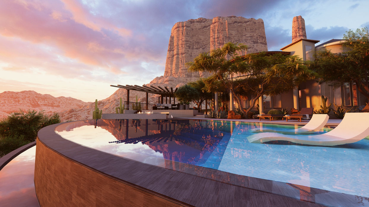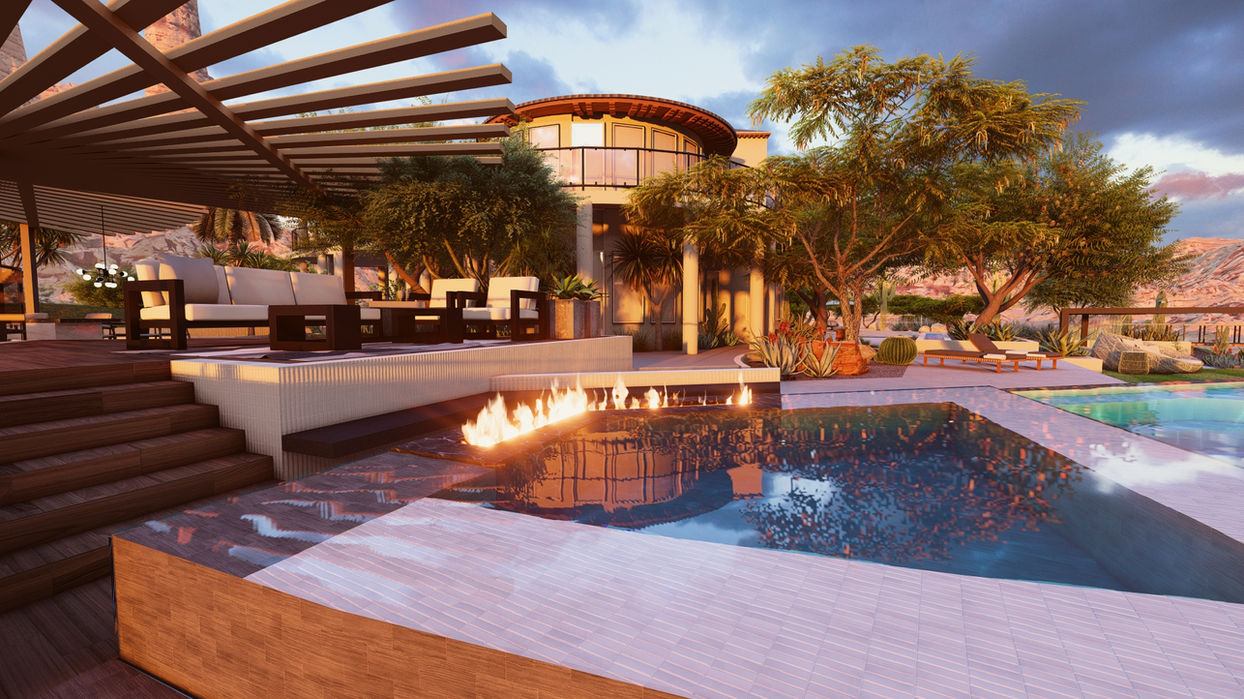 Immerse yourself in the serenity of this breathtaking desert oasis, where modern luxury meets natural beauty. Designed to capture the essence of desert living, this landscape features multiple outdoor living areas, seamlessly blending contemporary design with the rugged surroundings. The expansive infinity pool mirrors the desert's golden hues, while the integrated fire features create a warm and inviting ambiance as the sun sets behind the mountains. Elevated terraces, shaded by sleek pergolas, offer panoramic views, and the meticulously curated plantings add vibrant greenery to the sandy landscape. This project is a true testament to sophisticated outdoor living, providing a perfect escape in the heart of the desert.